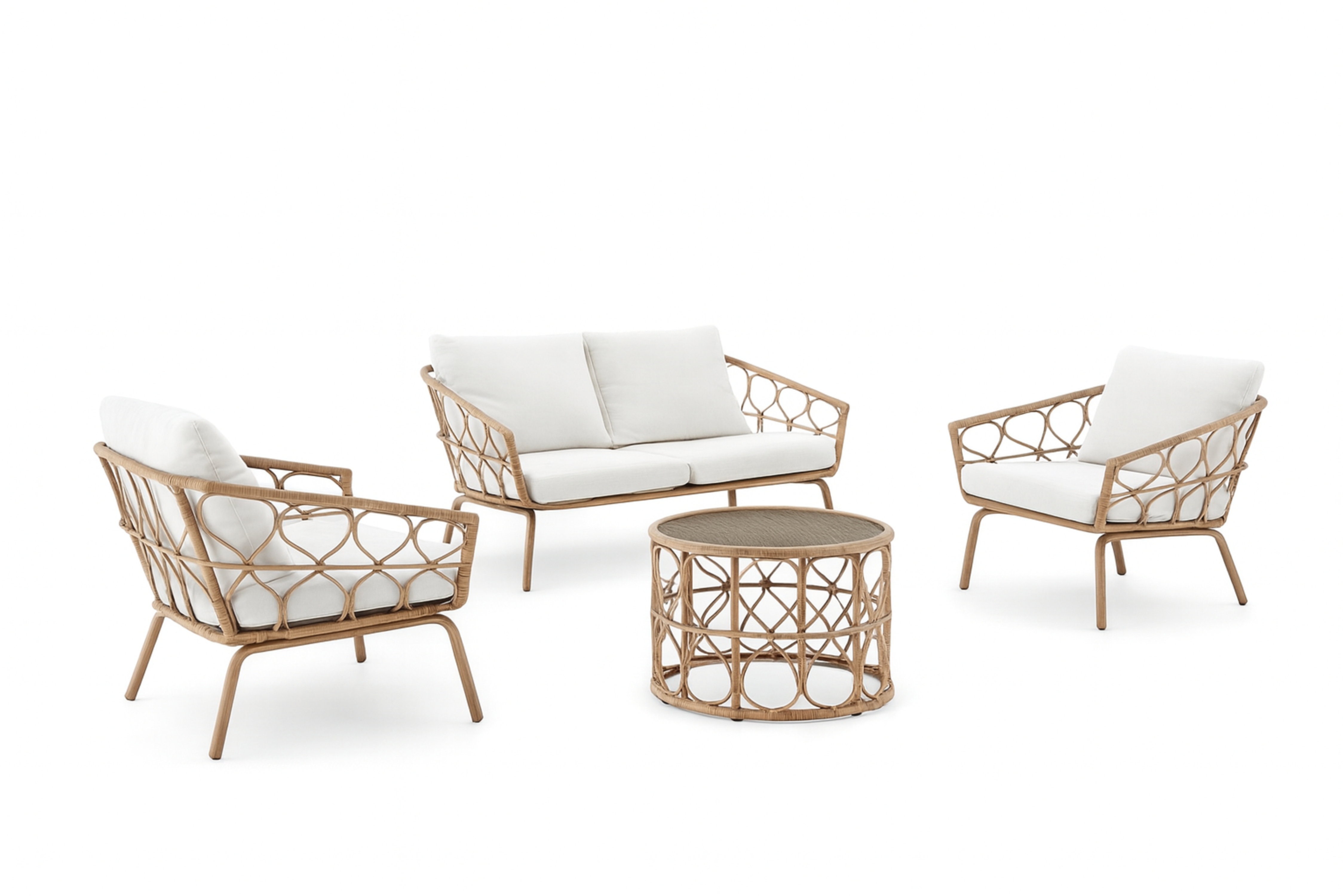 DS-007 – Natural – Incluye 2 sillones con brazos, 1 sofá de dos plazas y 1 mesa de centro – Ratán