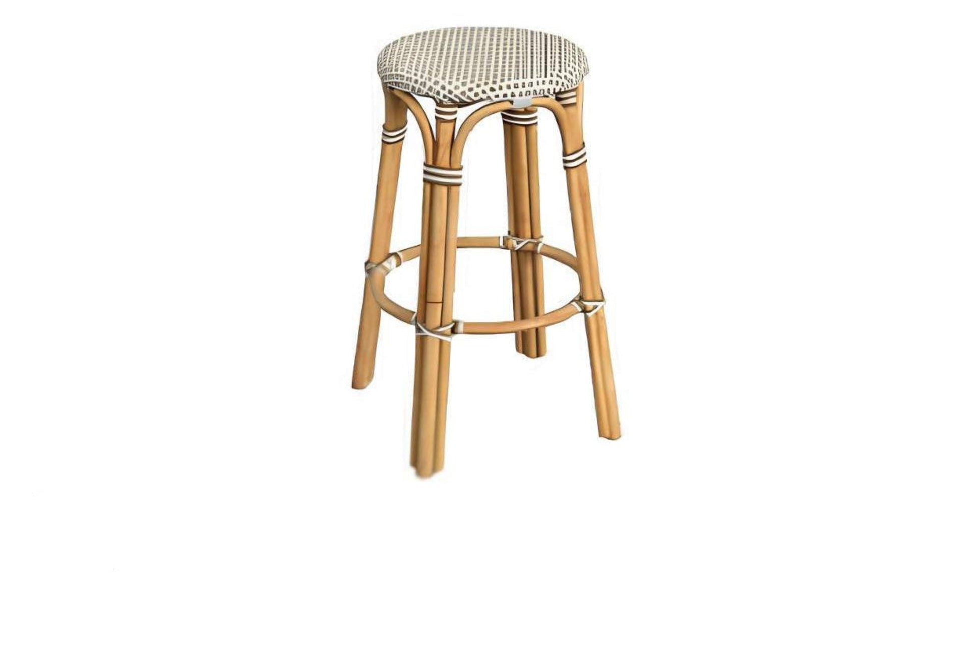 Canaliza la elegancia atemporal de los cafés franceses con este taburete de bar clásico francés de ratán redondo. Con un asiento redondo tejido a mano en una suave combinación de beige y blanco, este taburete fusiona comodidad y estilo con una gracia natural. Las patas curvas de ratán y los refuerzos envueltos aportan estabilidad sin perder su ligereza y encanto aireado.