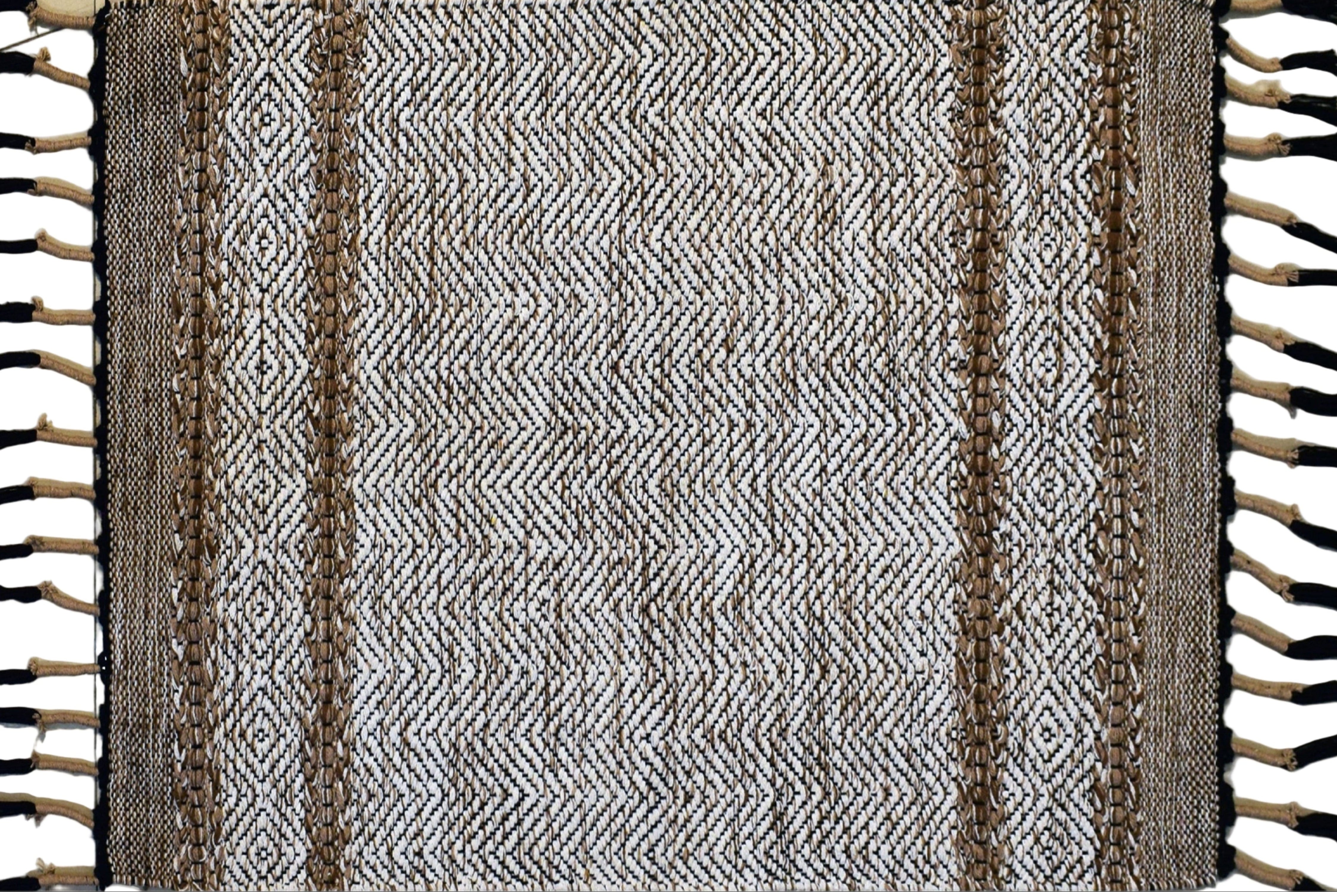 El borde sutil y los delicados flecos ofrecen un acabado refinado que realza el atractivo visual de la pieza, manteniendo su esencia artesanal auténtica. Esta alfombra versátil combina técnicas tradicionales de tejido con un diseño moderno y equilibrado, siendo el acento ideal para diversos estilos de interiores. 🌿🧵✨