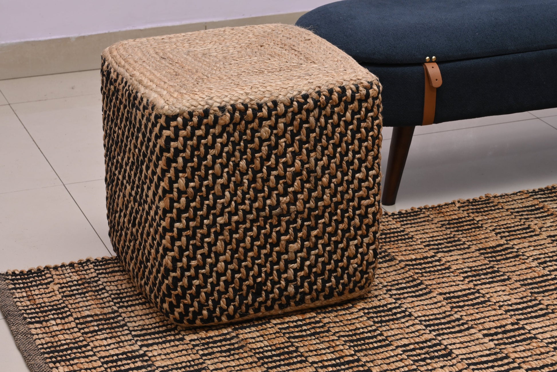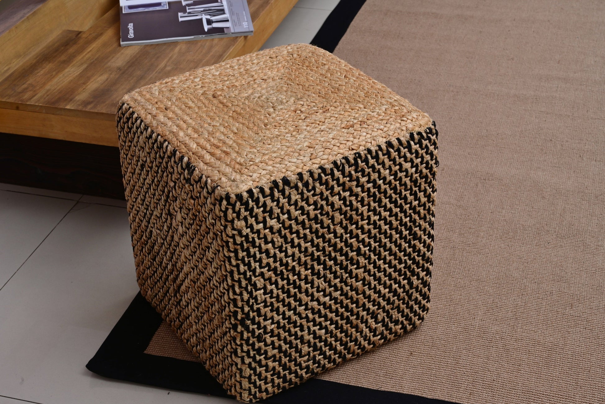 Puff Cuadrado de Yute Natural y Negro Tejido a Mano